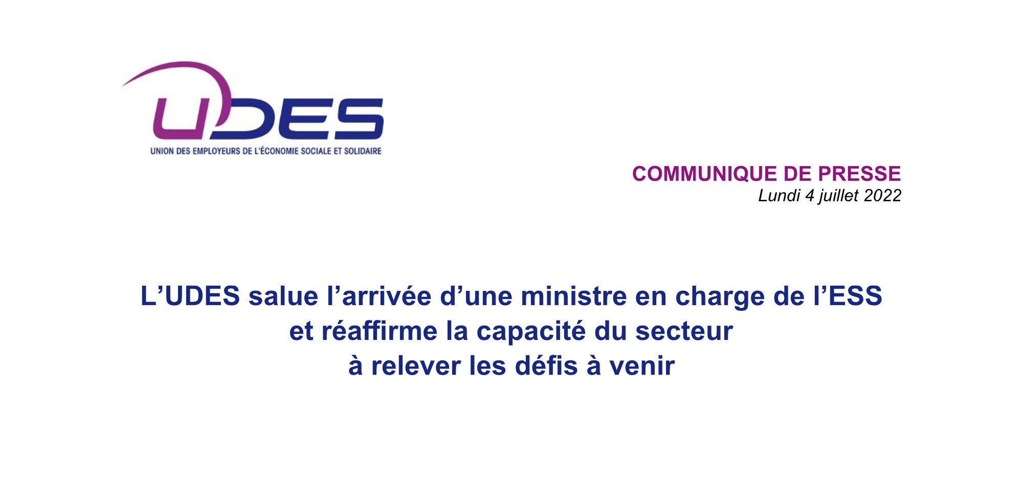 L’UDES salue l’arrivée d’une ministre en charge de l’ESS et réaffirme la capacité du secteur à relever les défis à venir.